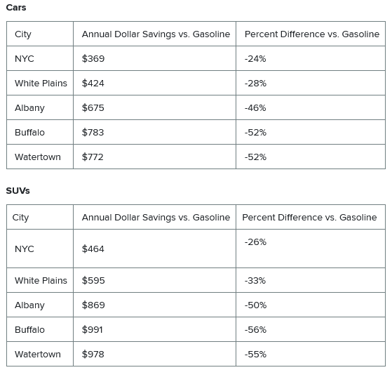 NYSERDA compared the price of gasoline with electricity rates, and results show that New Yorkers can save from 40 percent to almost 70 percent annually by driving an electric car or SUV. For example, instead of paying well over $4.00 per gallon at the gas pump, an EV driver would pay as little as $1.33 for an equivalent amount of electricity.