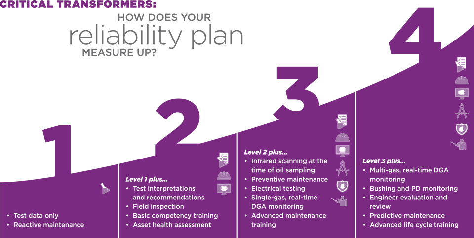 Clear standards exist for the chemical testing of transformer fluids. However, a great deal of discretion is applied to which transformers are tested and when. Coupled with advances in testing technologies and monitoring capabilities, there is a disparity of approaches when seeking to arrive at the best reliability plan for transformer fleets. Determining the consequences that may result from a failure is a good first step. Suggested steps in designing a reliability plan are outlined in Figure 2. While a Basic plan might suffice for a small pad-mount transformer, a more advanced plan would be warranted for a critical unit. Basic plans lead to the highest potential for unplanned outages. Whereas Assurance plans – while never guaranteeing that an outage will not occur – are by far the safest plans for critical units.
